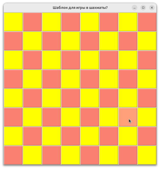 playground = ['yellow', 'salmon'] * (cols // 2)  # значение определяет цвет клетки